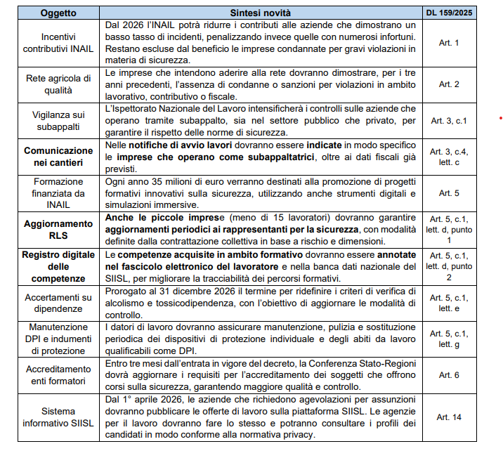 Di seguito una tabella di sintesi con le altre principali novità contenute nel DL n. 159/2025, con i rispettivi riferimenti normativi.