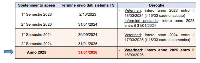 – scade entro il 31 gennaio dell’anno successivo a quello di sostenimento per quanto attiene le spese sanitarie (per le spese sostenute nel 2025, il termine scade il 31/01/2026, differito a lunedì 2/02/2026)